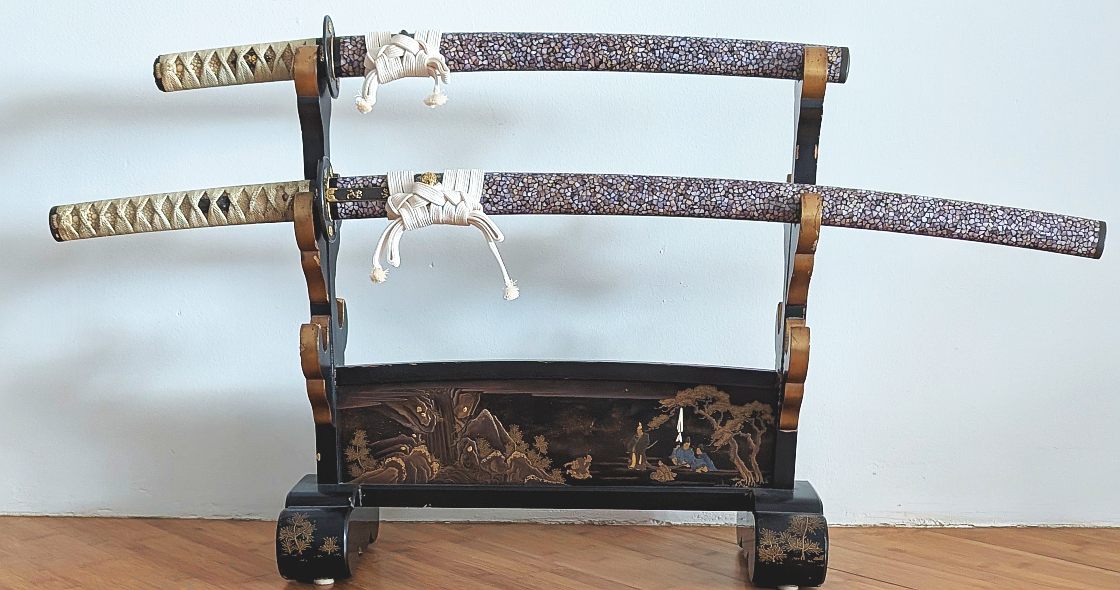 ITEM: DAISHO, Papers: BOTH NBTHK HOZON . Description: DAISHO, Set of swords Form: Katana & Wakizashi Length: Katana: 63,7 cm. Wakizashi: 43,1 cm. Both blades come in Shirasaya. Period: Mid 18th century. Material: Steel with golden parts. Description: Fantastic Koshirae. |